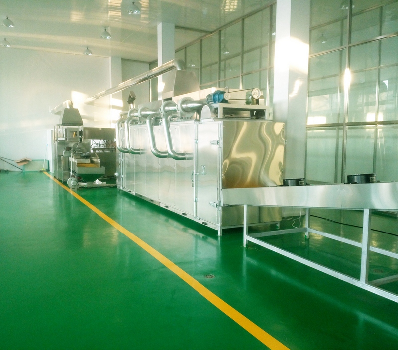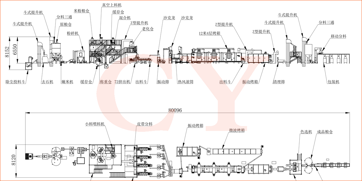 自動(dòng)配料預(yù)處理-粉碎-混合-擠壓熟化-均質(zhì)-震動(dòng)烘干-二次烘干-冷卻