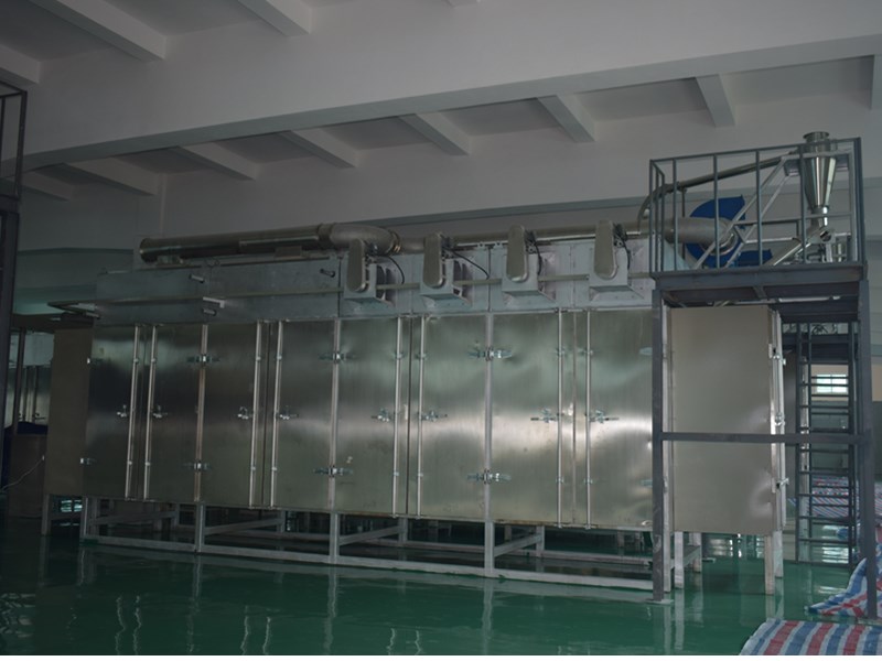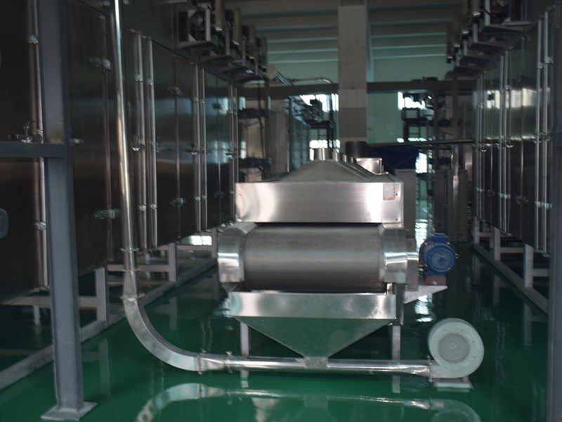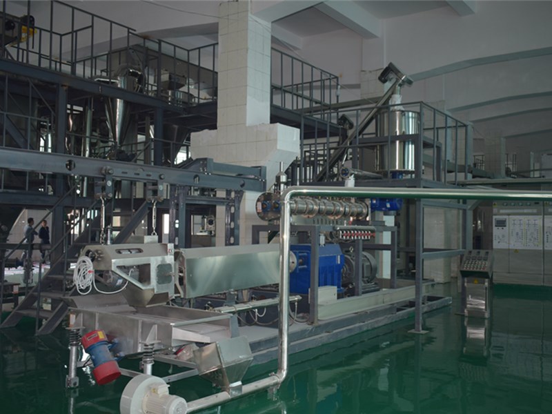 拌粉機(jī)→螺旋提料機(jī)→膨化主機(jī)→振動(dòng)篩→風(fēng)送機(jī)→壓片機(jī)→風(fēng)送機(jī)→冷卻攤料機(jī)→五層烘箱→提升機(jī)→震動(dòng)攤料機(jī)→高溫烘干機(jī)→提升機(jī)→單滾筒噴涂線→烘箱→冷卻輸送機(jī)