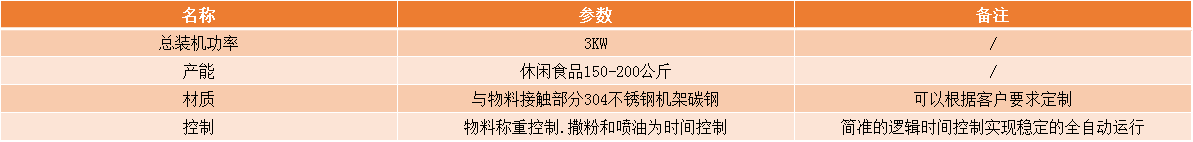 設(shè)備組成:400皮帶上料機(jī)、50kg稱重斗、25KG調(diào)味粉添加機(jī)、50L噴油機(jī)、50KG正反轉(zhuǎn)調(diào)味滾筒。