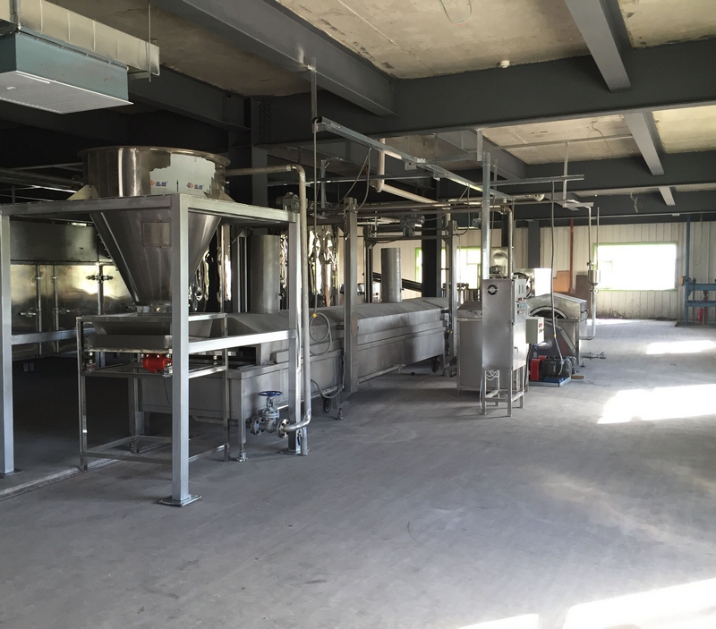 拌粉機(jī)→皮帶上料機(jī)→單螺桿擠出機(jī)→-提升機(jī)-八米五層干燥機(jī)-油炸機(jī)-震動(dòng)脫油機(jī)-單滾筒調(diào)味機(jī)